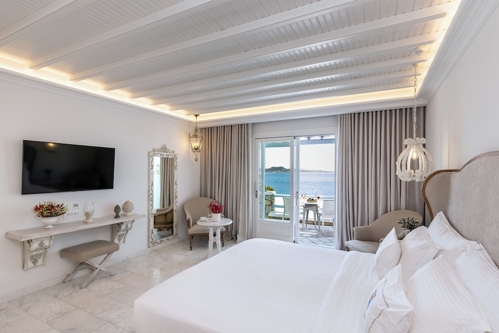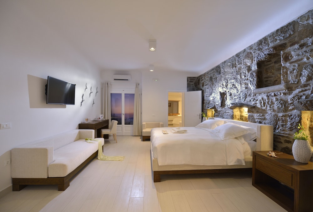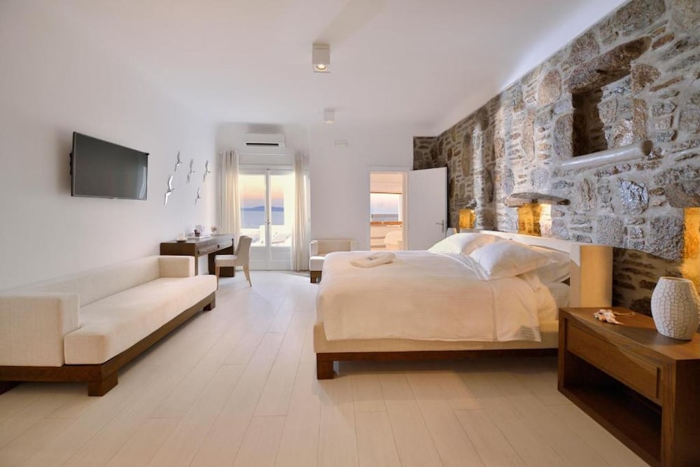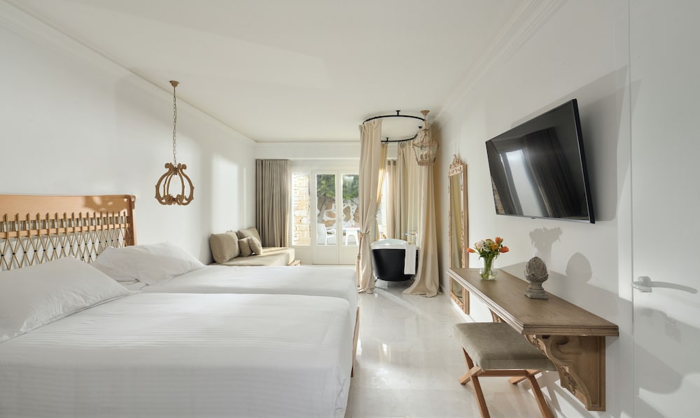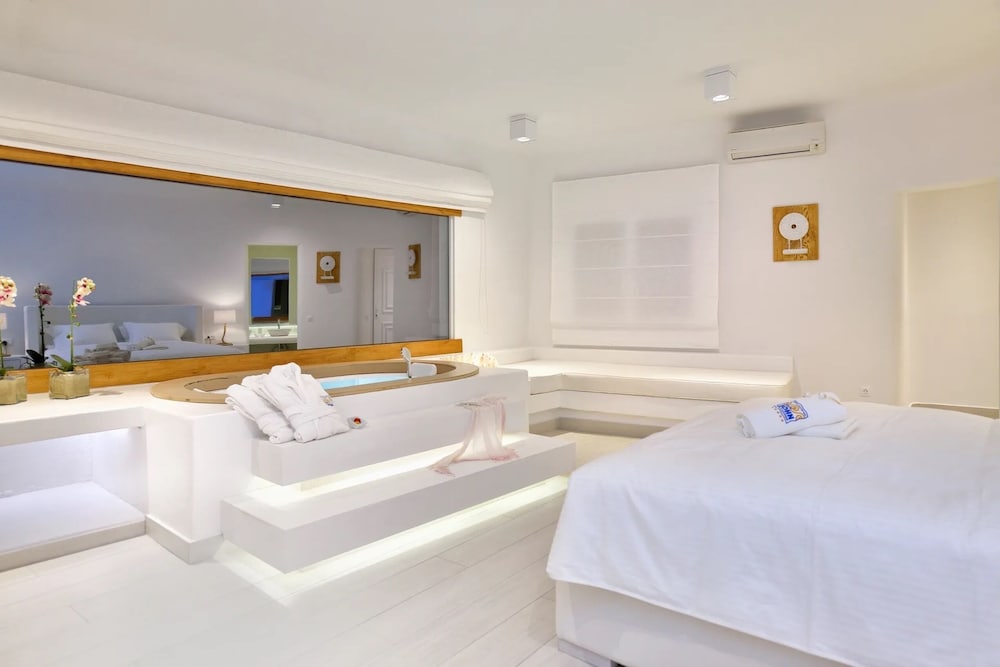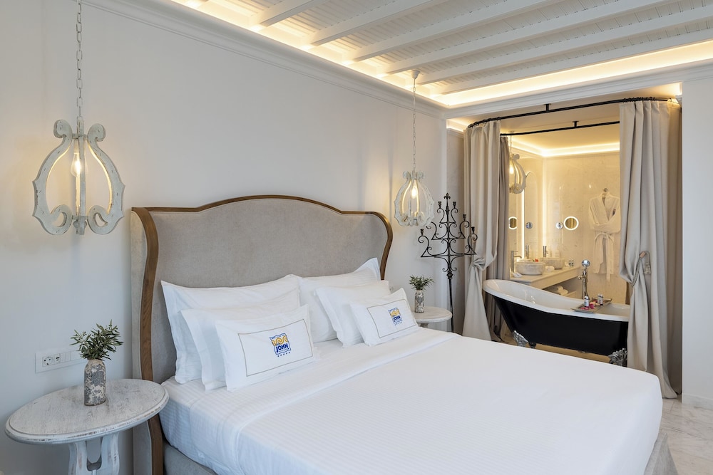 Når du har Saint John Hotel Villas & Spa i Mykonos som overnattingssted, bor du nær flyplassen, kun 10 minutter å kjøre fra Mykonos gamle havn og Vindmøllene i Mykonos. Dette hotellet ved stranden ligger 6,1 mi (9,8 km) unna Mykonos nye havn og 1,3 mi (2,1 km) unna Ornos-stranden. Føl deg som hjemme i et av de 153 aircondition-avkjølte gjesterommene som også har minibar og LCD-TV. Du kan holde deg oppdatert med inkludert kablet og trådløst internett, og underholdningen er sikret med parabol-TV. Badene har badekar eller dusj, toalettartikler (inkludert), og hårføner. Rommet har telefon, samt safe og kaffetrakter/tekoker. Avstandene som vises er rundet av til nærmeste 0,1 kilometer.