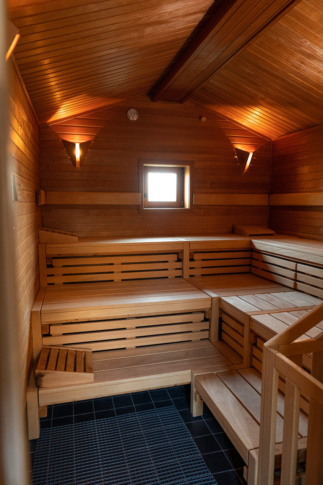 Stort innendørsbasseng (7,81 m x 14,55 m, 28 °C) med ekstra barne- og babybasseng (32 °C), badstue utendørsbasseng (12 m x 7 m, dybde 1,35 m) med solterrasse, innendørs og utendørs dusjer, finsk utendørs badstue og økologisk utendørs badstue, avslapningsrom med store vinduer.