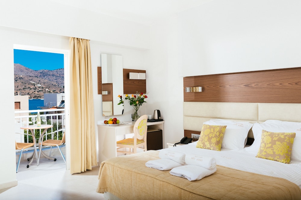 Har du Elounda Akti Olous - Adults only i Agios Nikolaos som overnattingssted, er du på stranden og kun 3 minutters gange fra Hiona-stranden og 9 minutter unna Alykes av Elounda til fots.  Dette hotellet ved stranden ligger 0,5 mi (0,8 km) unna Elounda-vindmøllene og 0,5 mi (0,9 km) unna Poros Elounda kristne basilika. Føl deg som hjemme i et av de 70 aircondition-avkjølte gjesterommene som også har kjøleskap og LCD-TV. Rommene har egen møblert balkong. Du kan holde deg oppdatert med wi-fi (inkludert) på rommet, og underholdningen er sikret med parabol-TV. Badene inkluderer toalettartikler (inkludert) og hårføner. Avstandene som vises er rundet av til nærmeste 0,1 kilometer.