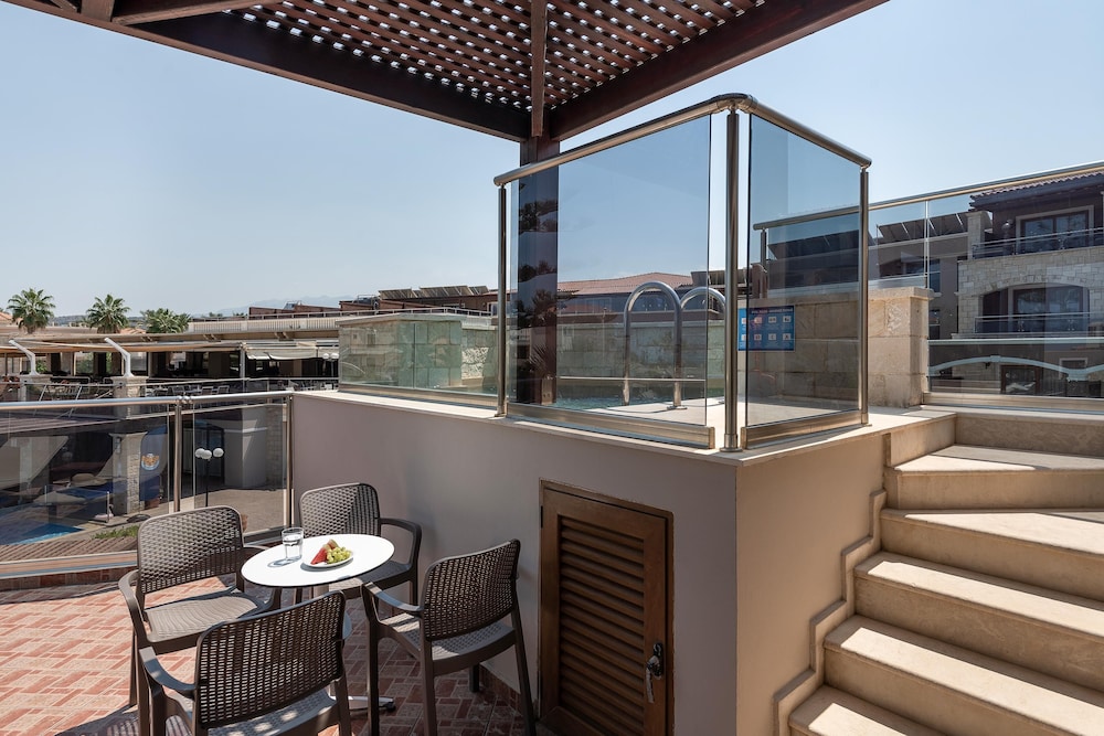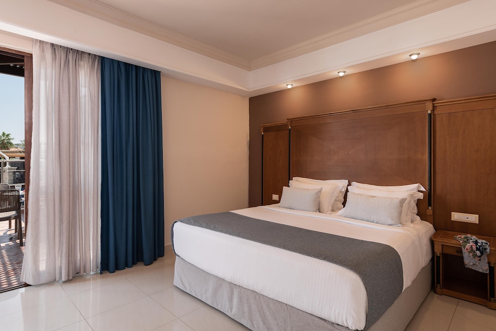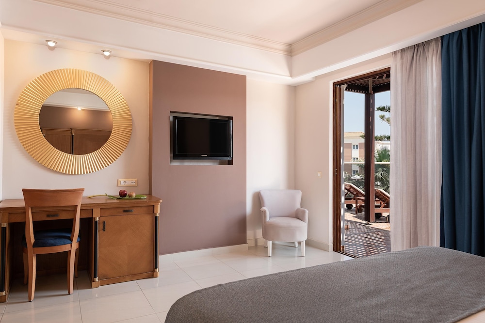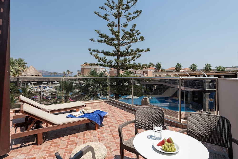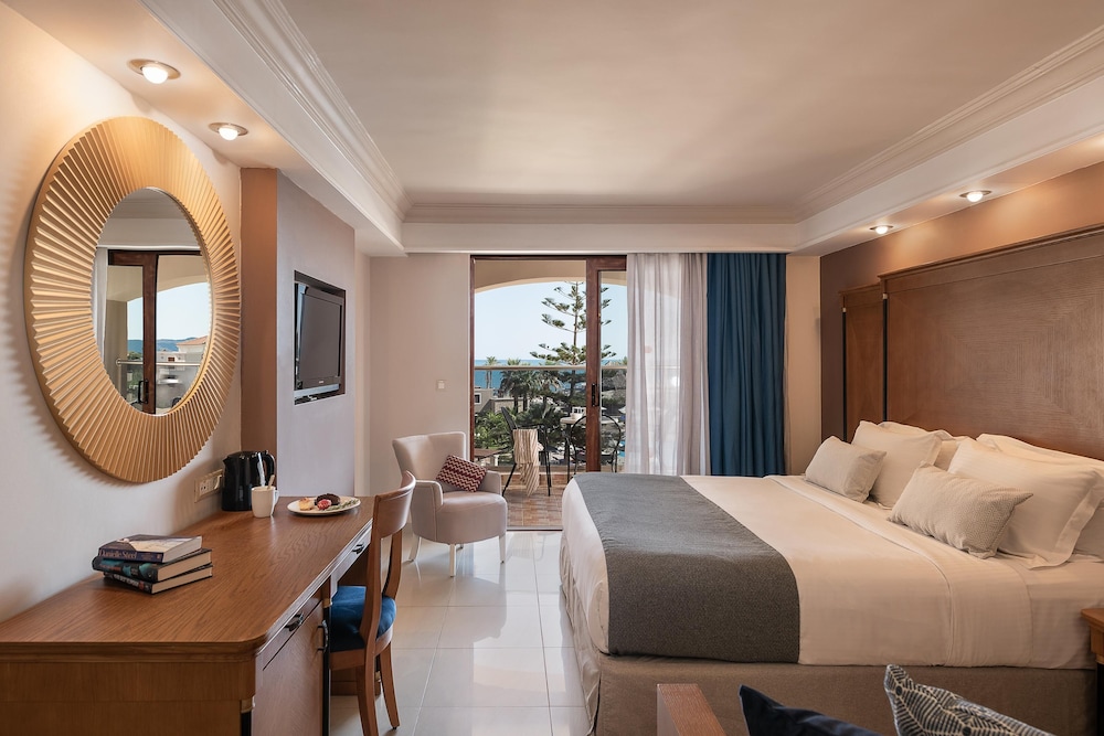 Når du har Caldera Creta Paradise i Platanias som overnattingssted, bor du på stranden, kun 15 minutter å kjøre fra Agia Marina strand og Kalamaki Beach. Dette resort-hotellet ved stranden ligger 7,9 mi (12,7 km) unna Den gylne stranden og 9,1 mi (14,6 km) unna Nea Khora strand. Føl deg som hjemme i et av de 285 aircondition-avkjølte gjesterommene som også har minibar og Flatskjerm-TV. Du kan holde deg oppdatert med wi-fi (inkludert) på rommet, og underholdningen er sikret med parabol-TV. Badene har badekar og hårføner. Rommet har telefon, samt safe og skrivebord. Avstandene som vises er rundet av til nærmeste 0,1 kilometer.