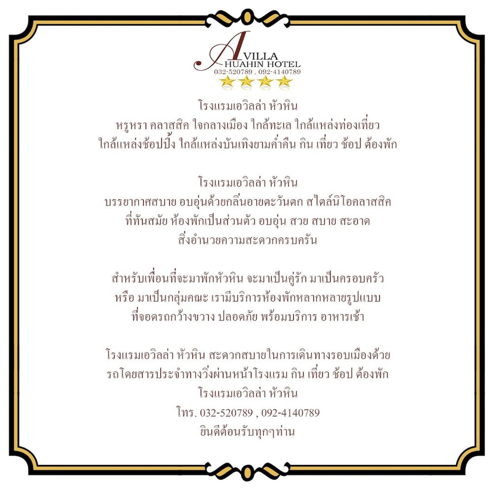 Gjester har tilgang til blant annet renseri-/vaskeritjenester, en døgnåpen resepsjon og bagasjeoppbevaring. Gjestene tilbys flyplasstransport og henting på togstasjonen mot et tillegg. Nyt utsikten fra en terrasse og en hage og dra nytte av fasiliteter som wi-fi (inkludert). Dette hotellet i kolonialstil har i tillegg shoppingmuligheter, tur-/billettassistanse og piknikområde. Som gjest på A Villa Huahin Hotel kan du innta et måltid i restauranten eller stikke innom snackbaren/delikatesseforretningen. Ferdiglaget frokost tilbys daglig fra kl. 07.00 til kl. 10.30 mot et tillegg.Du vil måtte betale følgende på overnattingsstedet: