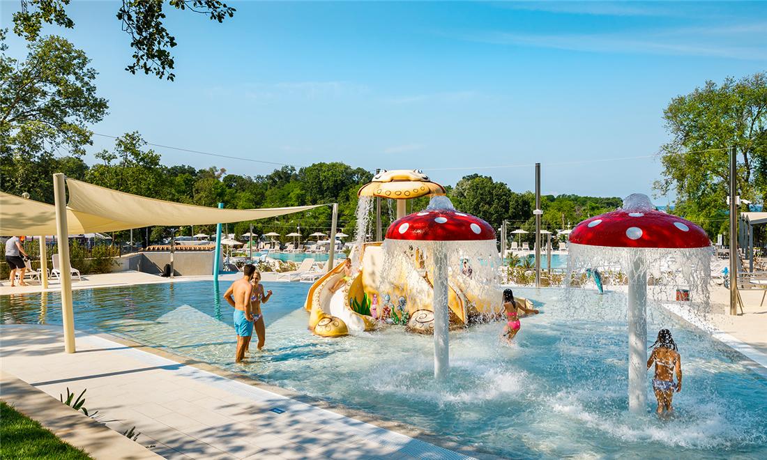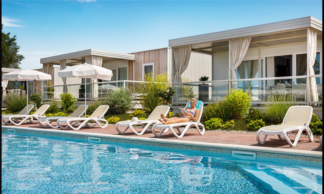 Campingplassen har flere utendørsbassenger. Du har tilgang til solsenger ved bassengområdet (mot avgift). Innen gangavstand fra campingvognene er det en strand med saltvannsbasseng, solstoler og parasoll (mot avgift). Stranden består av anlagte badeterrasser og flere bukter med klipper og rullestein.