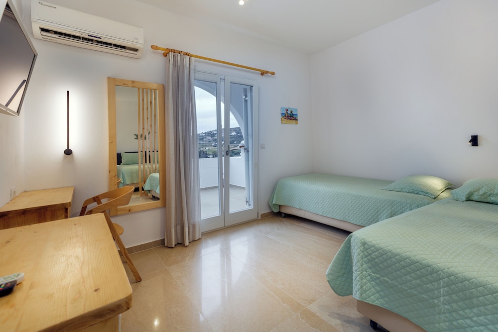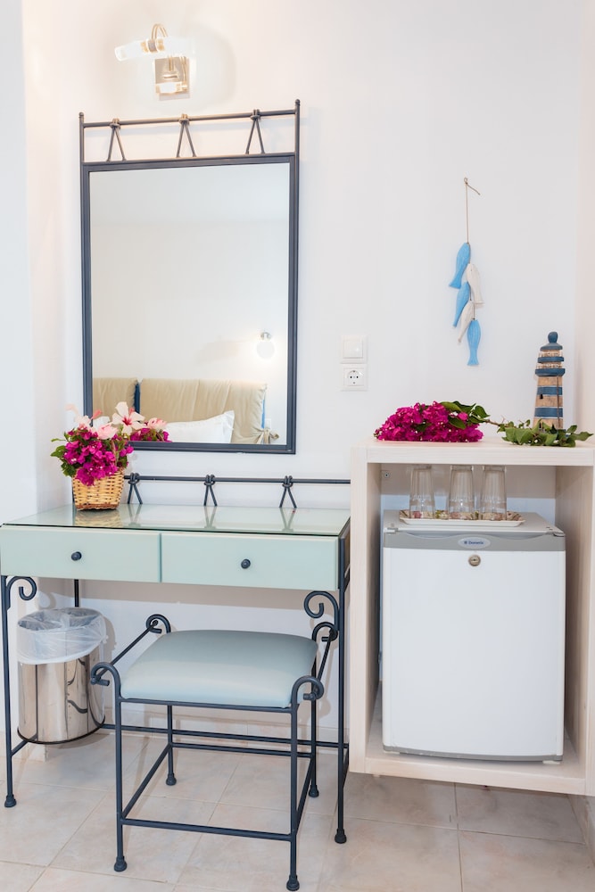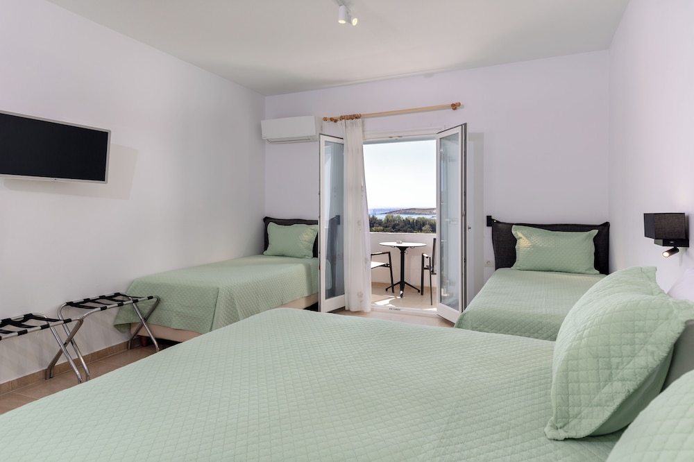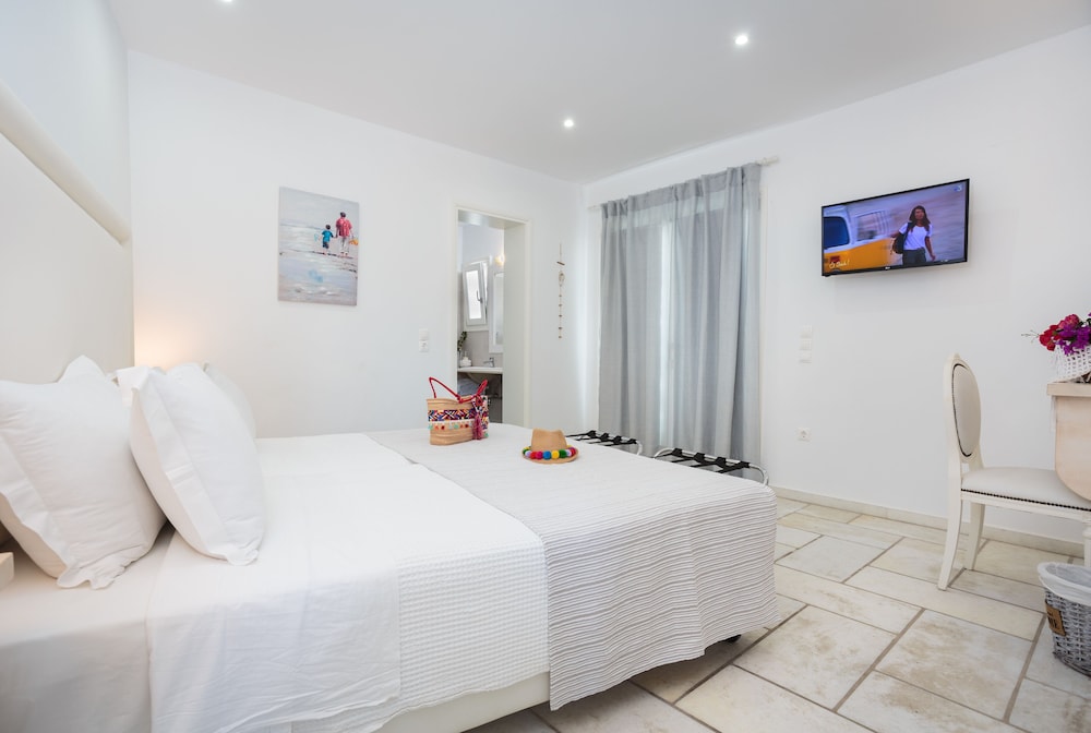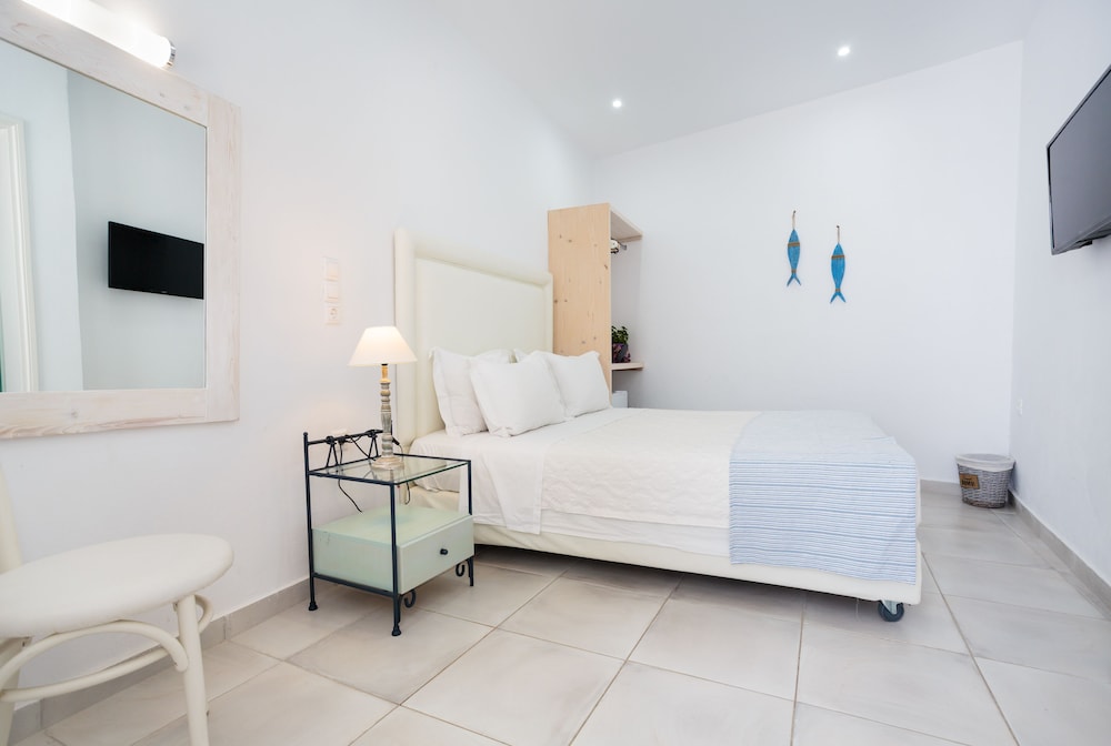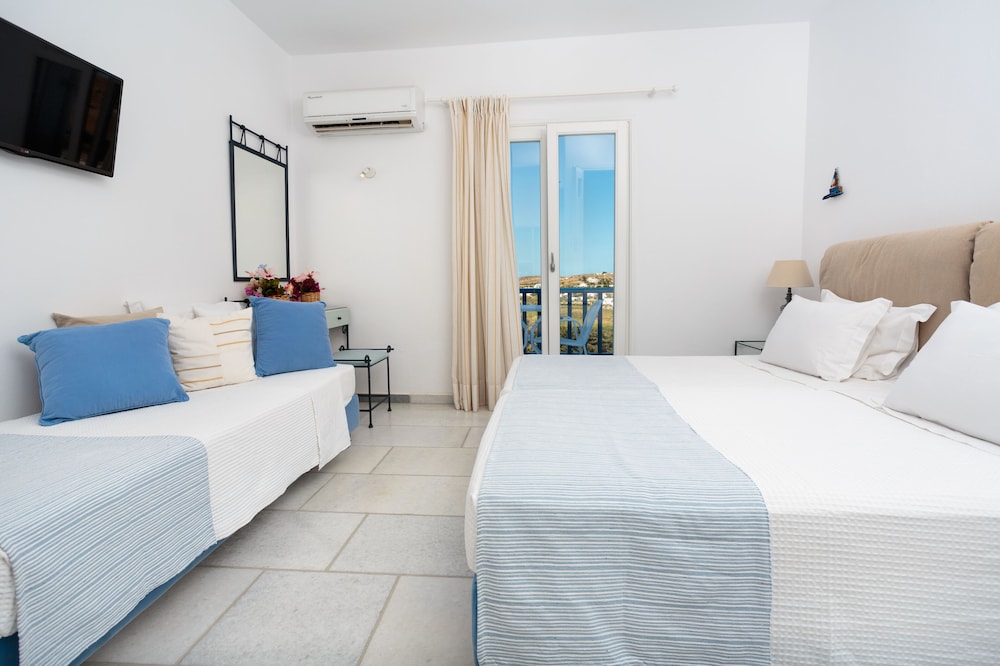 Når du har Pyrgaki Hotel i Paros som overnattingssted, bor du nær flyplassen, kun 4 minutter å kjøre fra Parikia havn og 9 minutter fra Naousa-havnen. Dette hotellet med familievennlig profil ligger 21,4 mi (34,4 km) unna Naxos havn og 22,5 mi (36,3 km) unna Agios Georgios strand. Føl deg som hjemme i et av de 25 gjesterommene, som er individuelt dekorert og utstyrt med kjøleskap og LCD-TV. Rommene har egen balkong eller terrasse. Du kan holde deg oppdatert med wi-fi (inkludert) på rommet, og underholdningen er sikret med parabol-TV. Rommene har privat bad med kombinert dusj/badekar, regndusjhode og toalettartikler (inkludert). Avstandene som vises er rundet av til nærmeste 0,1 kilometer.