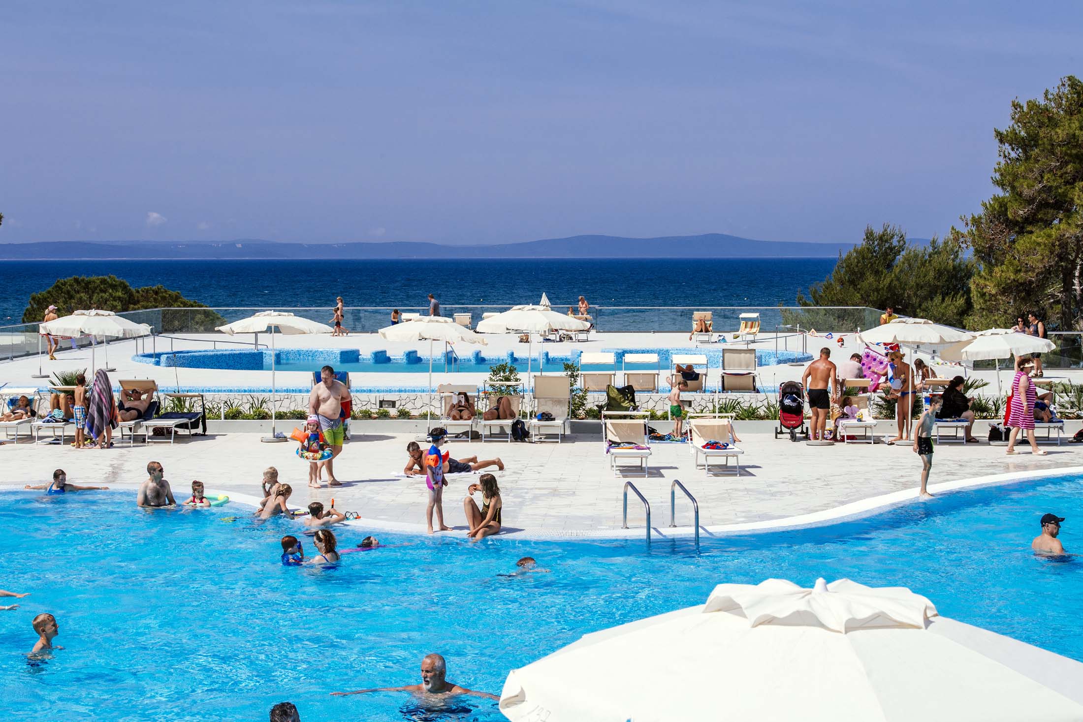 Det beste med Zaton Holiday Resort er nok det store bassengområdet. Her kan du enkelt finne ditt eget favorittbasseng blant de totalt ni tilgjengelige. På solterrassen er det rikelig med plass til å sole seg og bare slappe av – du kan leie en solseng og parasoll eller bare bre ut ditt eget håndkle. Et steinkast fra stranden ligger stranden. Den er en drøy kilometer lang med dusjer, lekeplasser og noen barer som serverer enklere retter.
