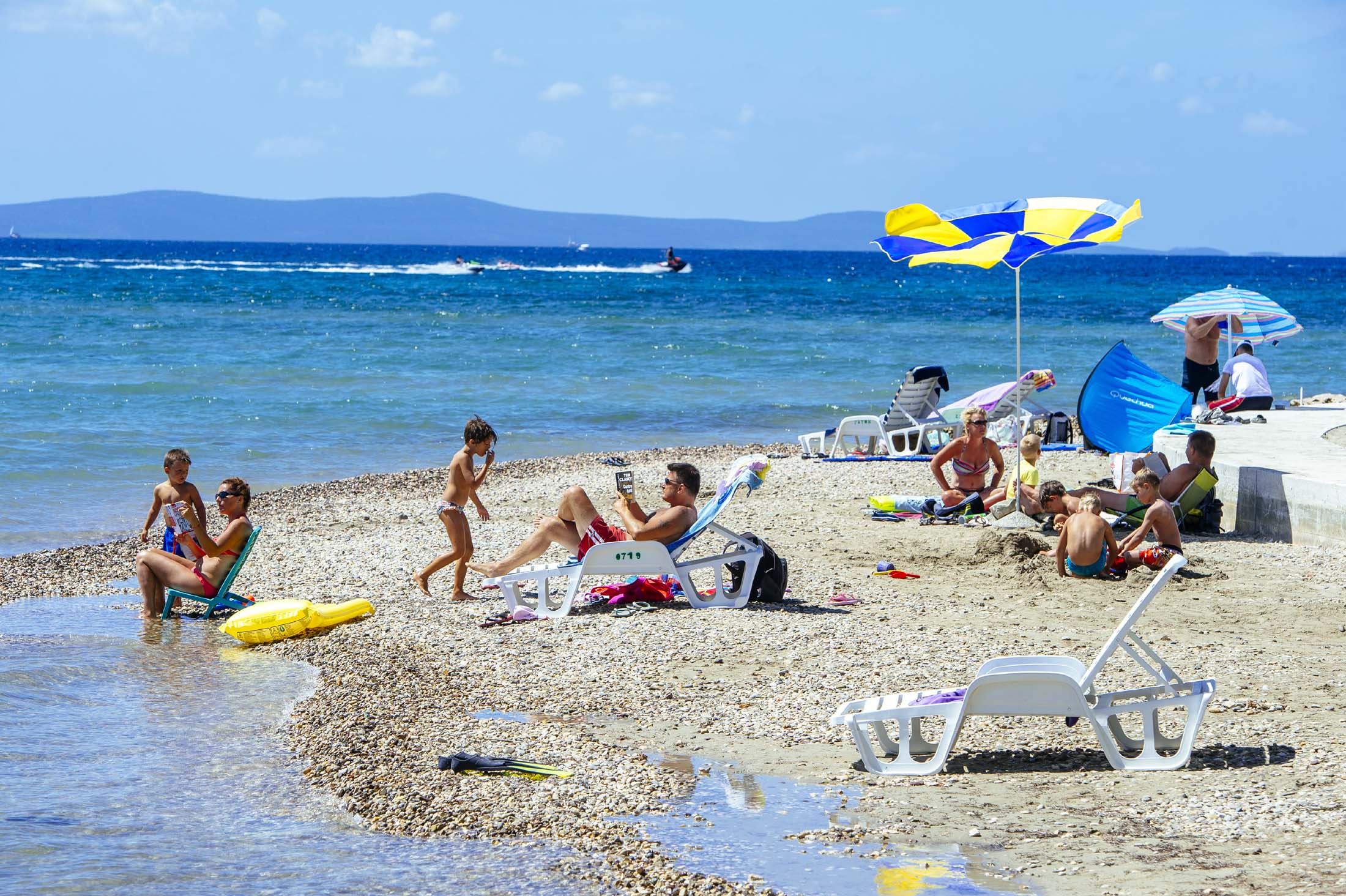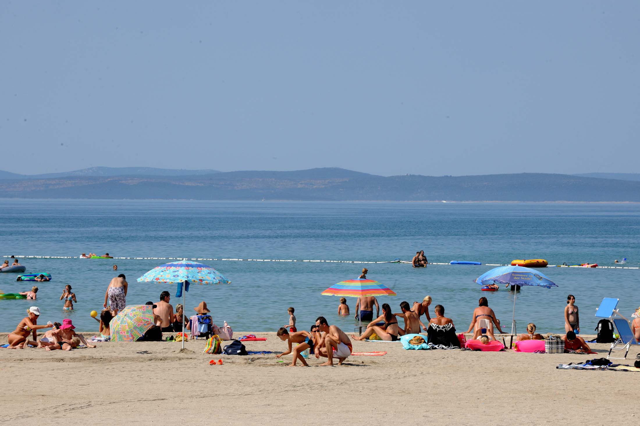 Strandtype: 1 500 m langgrunn sand-/grusstrand med ditto bunn. Solstoler og parasoller – mot avgift